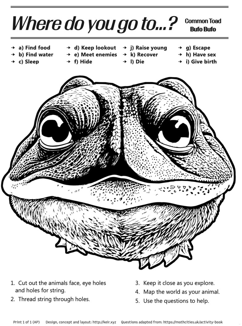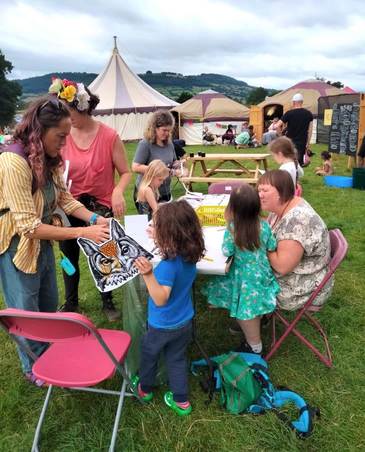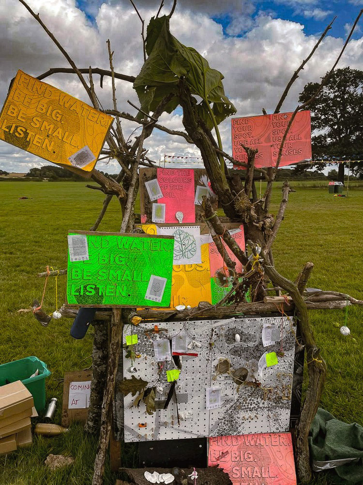 Over three weekends, I collaborated with researchers Dr Male Luján Escalanté (UAL) and Marie Williams (Dream Networks/UCL) to deliver workshops to over 500 festival-goers. Using cultural probe-style research kits, participants observed and recorded non-human actors such as plants, animals, and ecological processes, creating a collective map that evolved throughout the festival. This approach reframed the campsite as a shared ecosystem and sparked conversations about interdependence and sustainability.