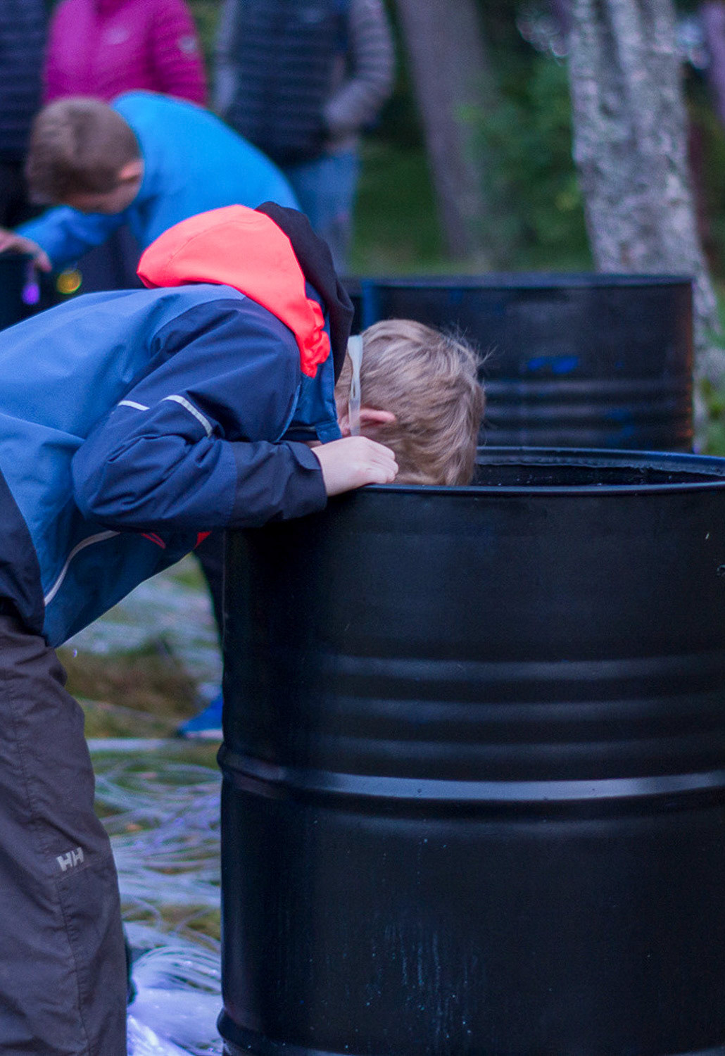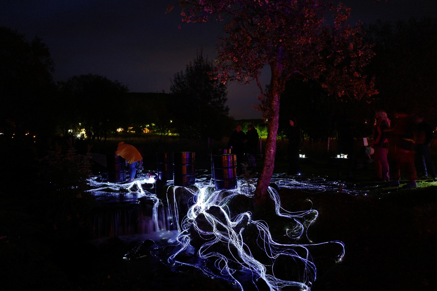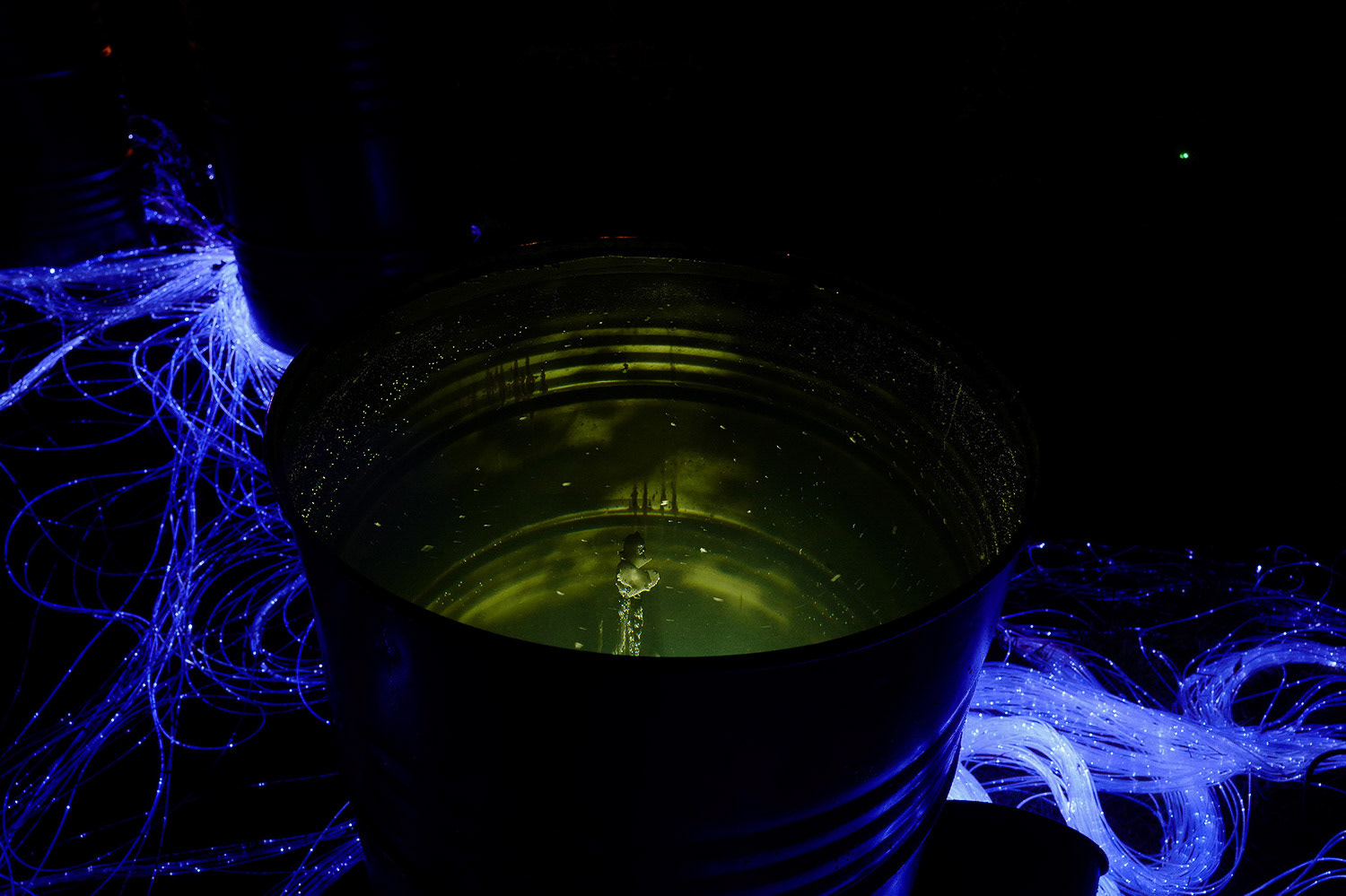 Installed along the banks of a stream on Hadseløya, oil drums filled with water contained wax sculptures submerged beneath the surface. Visitors were invited to wear viewing goggles and immerse their faces underwater, holding their breath to encounter the illuminated forms below.
