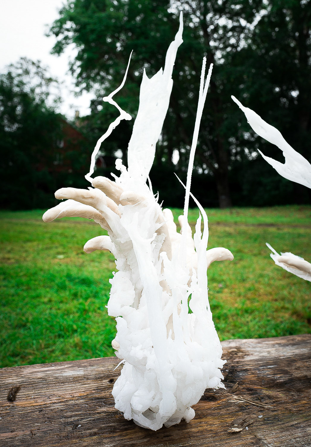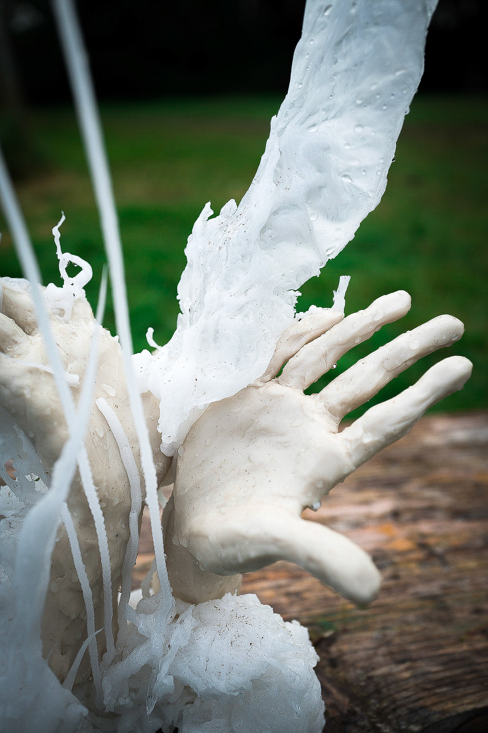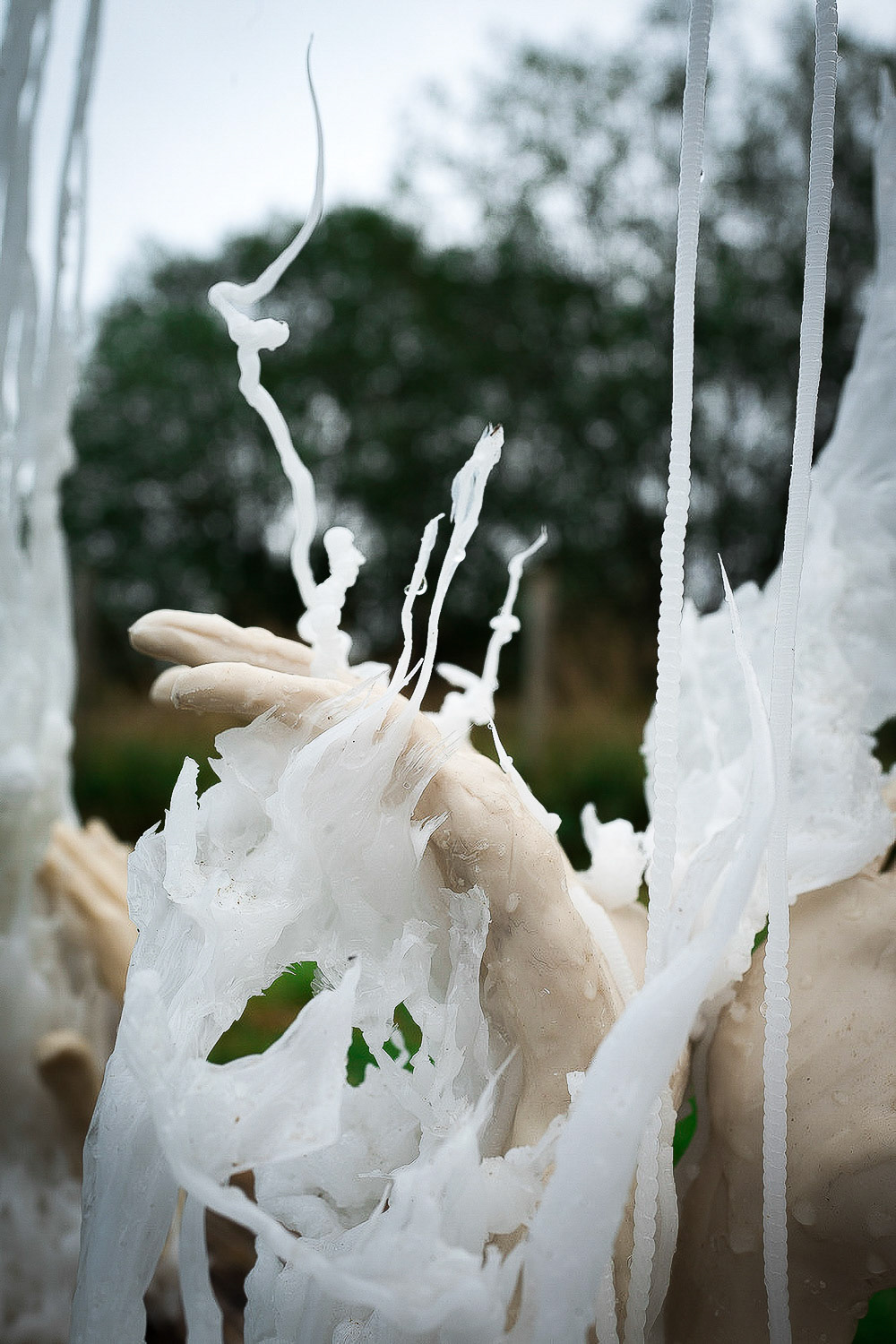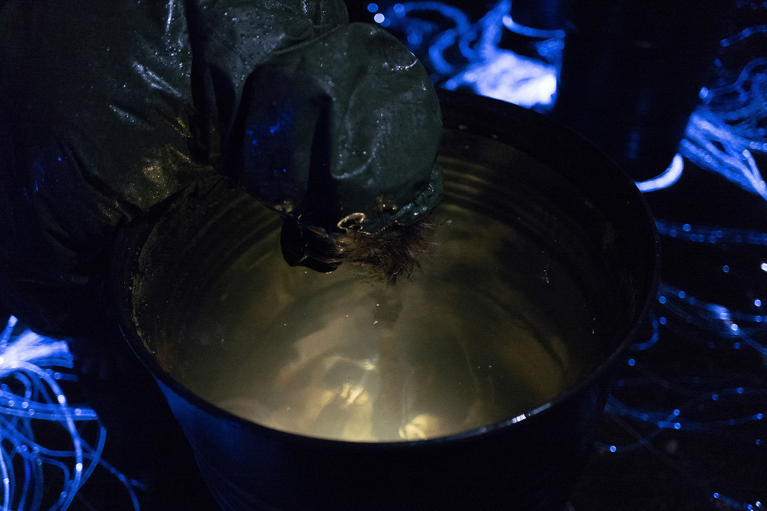 Installed along the banks of a stream on Hadseløya, oil drums filled with water contained wax sculptures submerged beneath the surface. Visitors were invited to wear viewing goggles and immerse their faces underwater, holding their breath to encounter the illuminated forms below.
