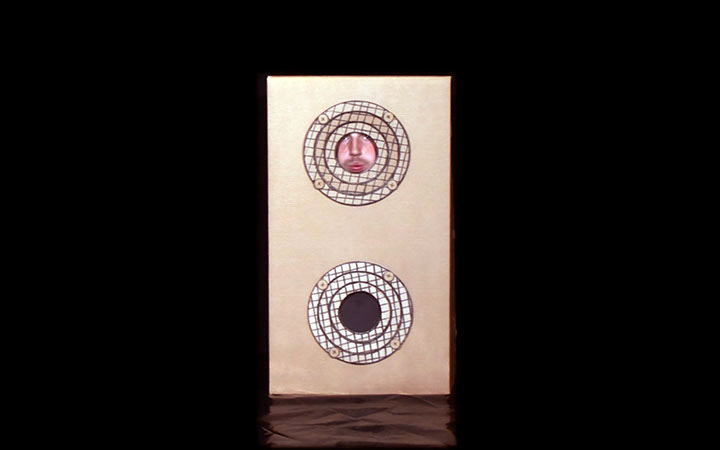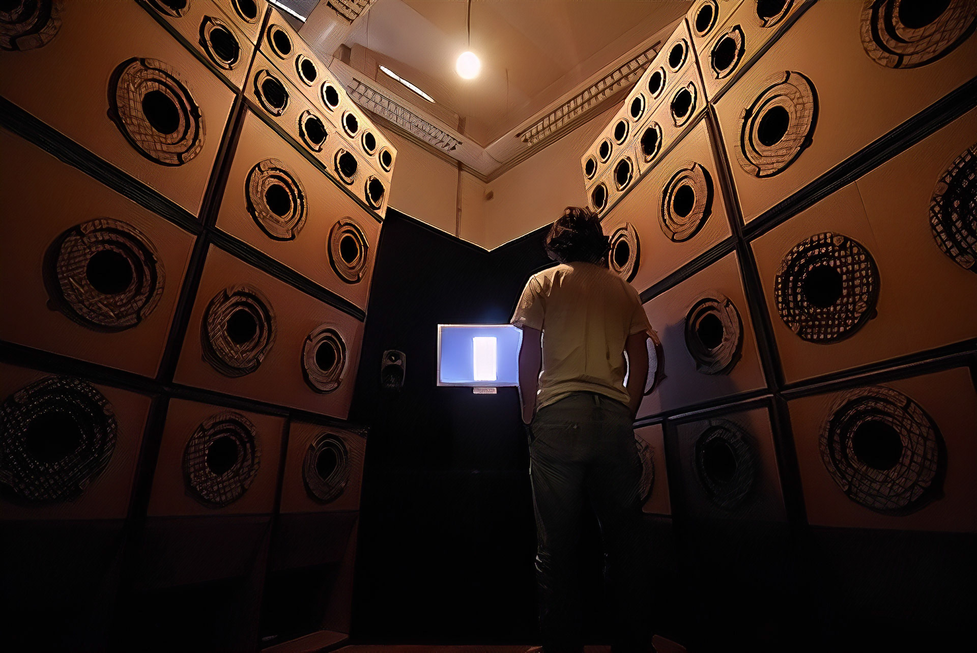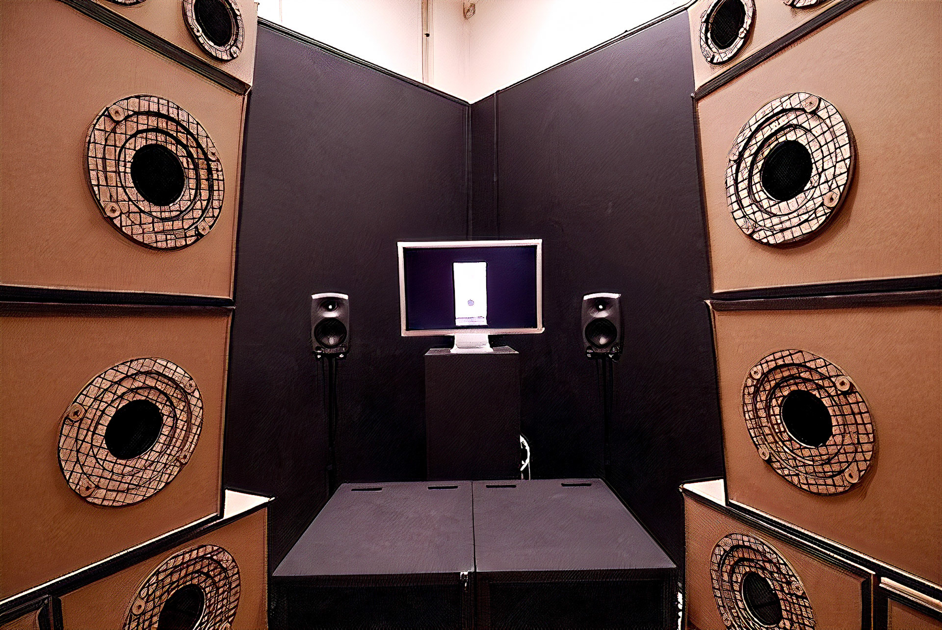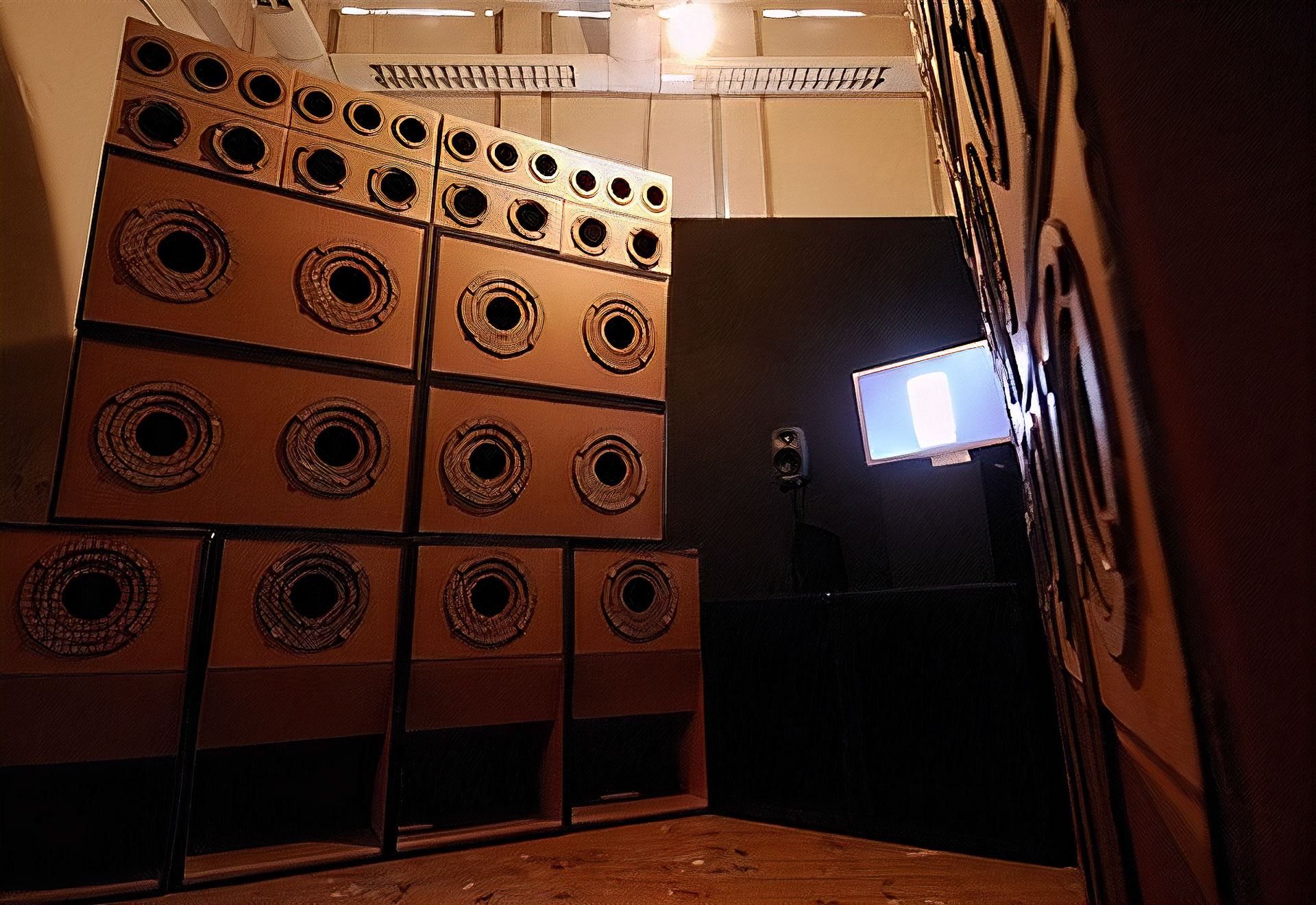 The work features a figure dressed as a speaker, shown on screen beatboxing. As viewers move towards the projection, a sonic range sensor activates a high-powered sound system. The performer’s voice is transformed into a deep bassline that fills the space, transmitted through a 10k speaker rig and inducers embedded in the walls and floor, creating vibration that can be felt throughout the body.