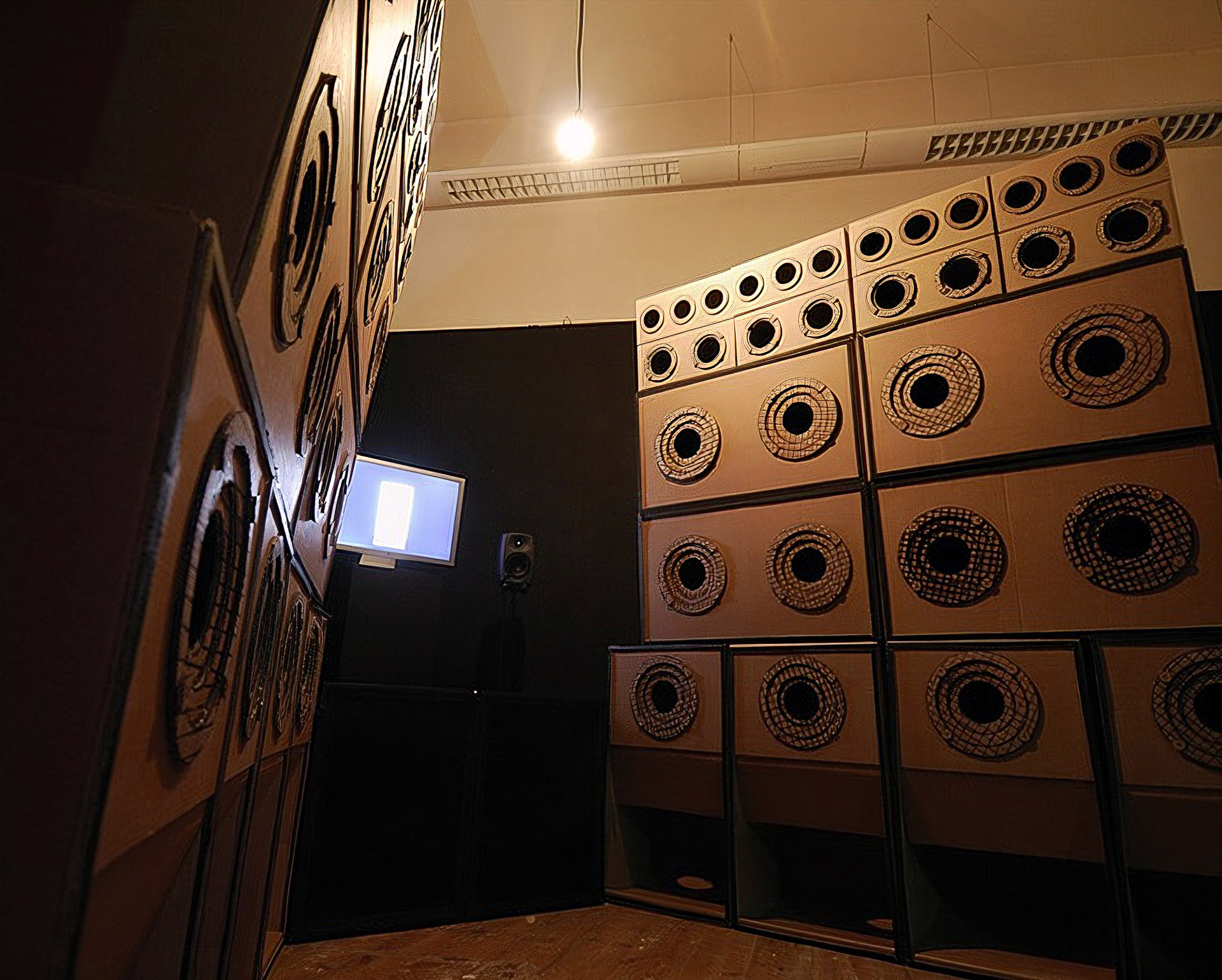 Materials and technologies: installation, cardboard, 10k sound system, sonic range sensor, A/V and DMX-controlled lighting.