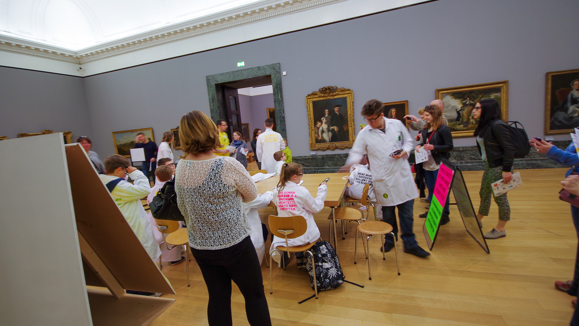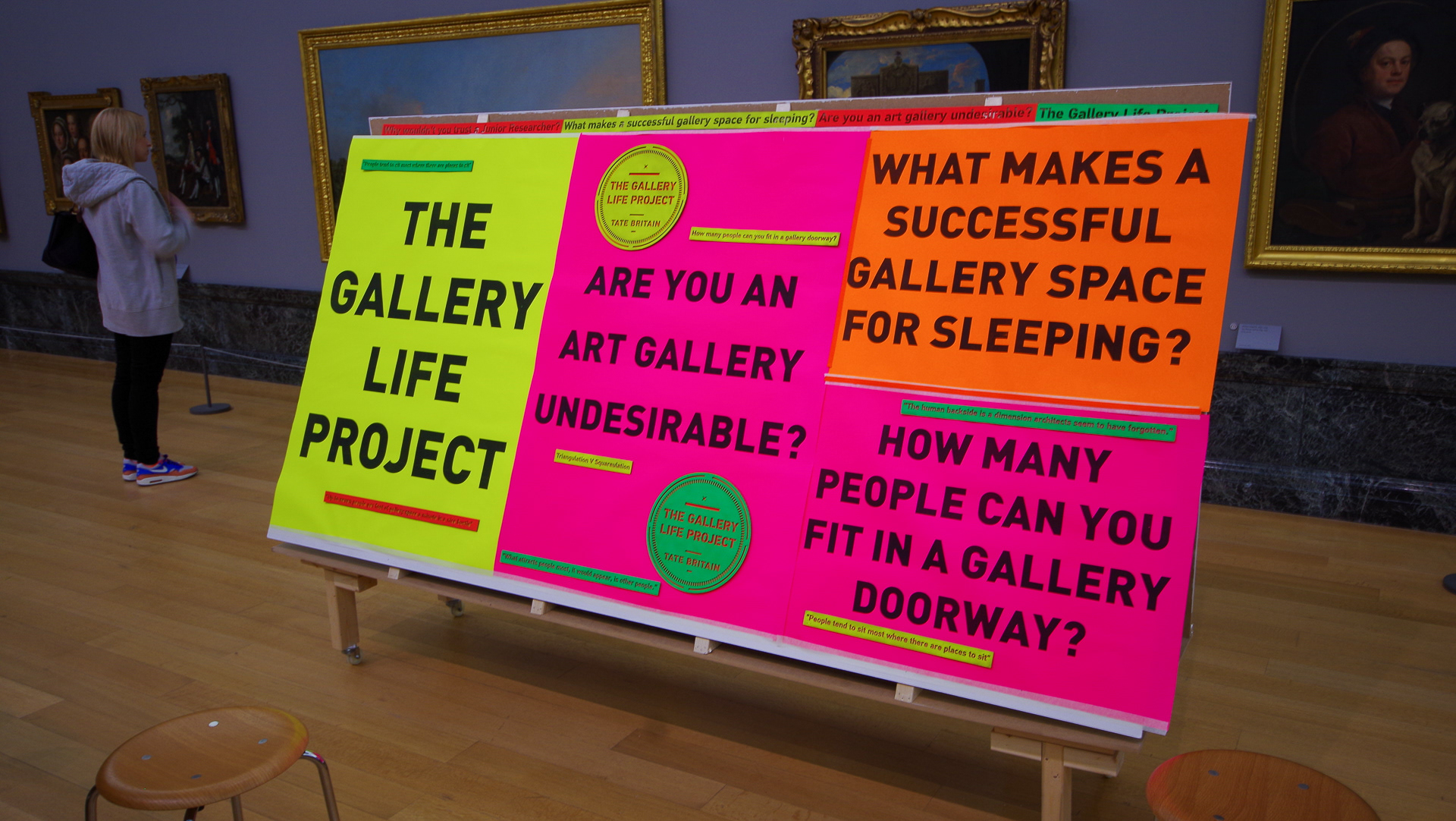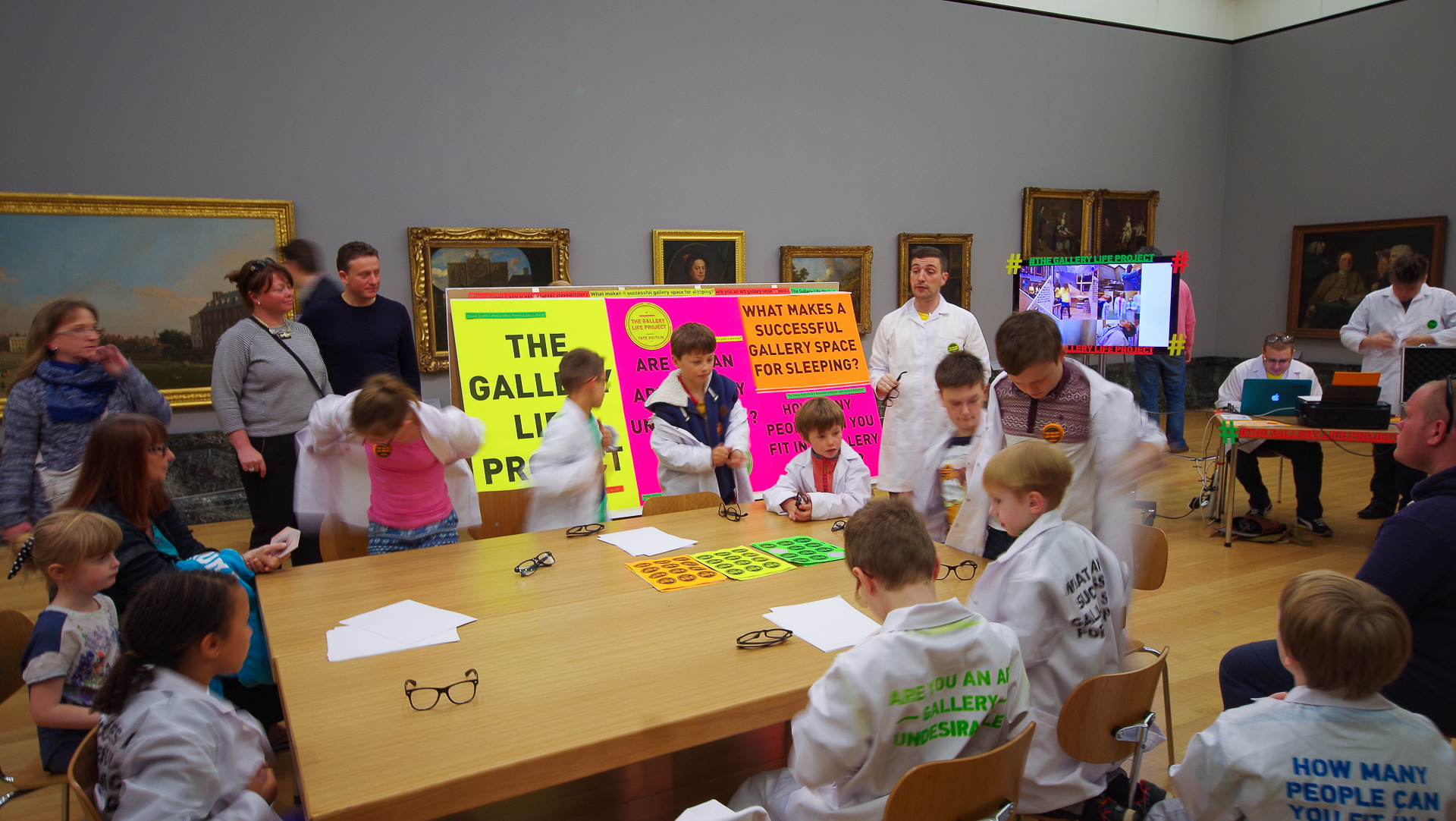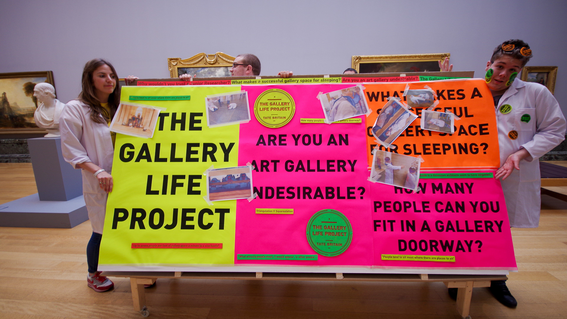 For this neurodiverse, superhero‑style takeover of Tate Britain in 2014, we worked as performance duo chris+keir to create a live research hub for 500 young people with Tourettes and associated conditions. Using neon, stickers, priceless art, cameras, lab coats, comedy glasses and William Whyte’s The Social Life of Small Urban Spaces, we transformed the galleries into a space for playful investigation and collective mischief.